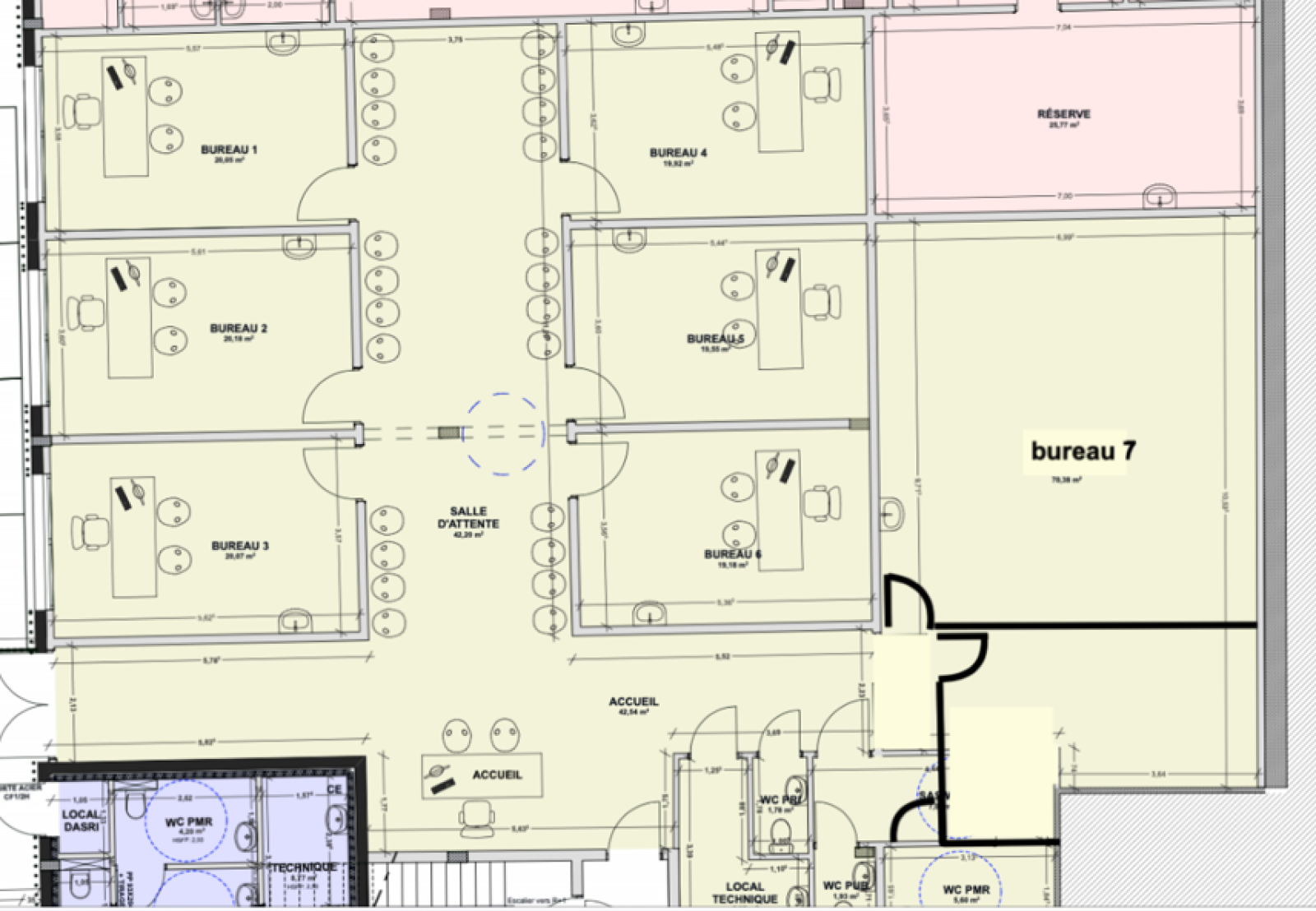 grand hall d'entrée/d'accueil commun pour 7 cellules (à louer individuellement) d'environ 20 m²