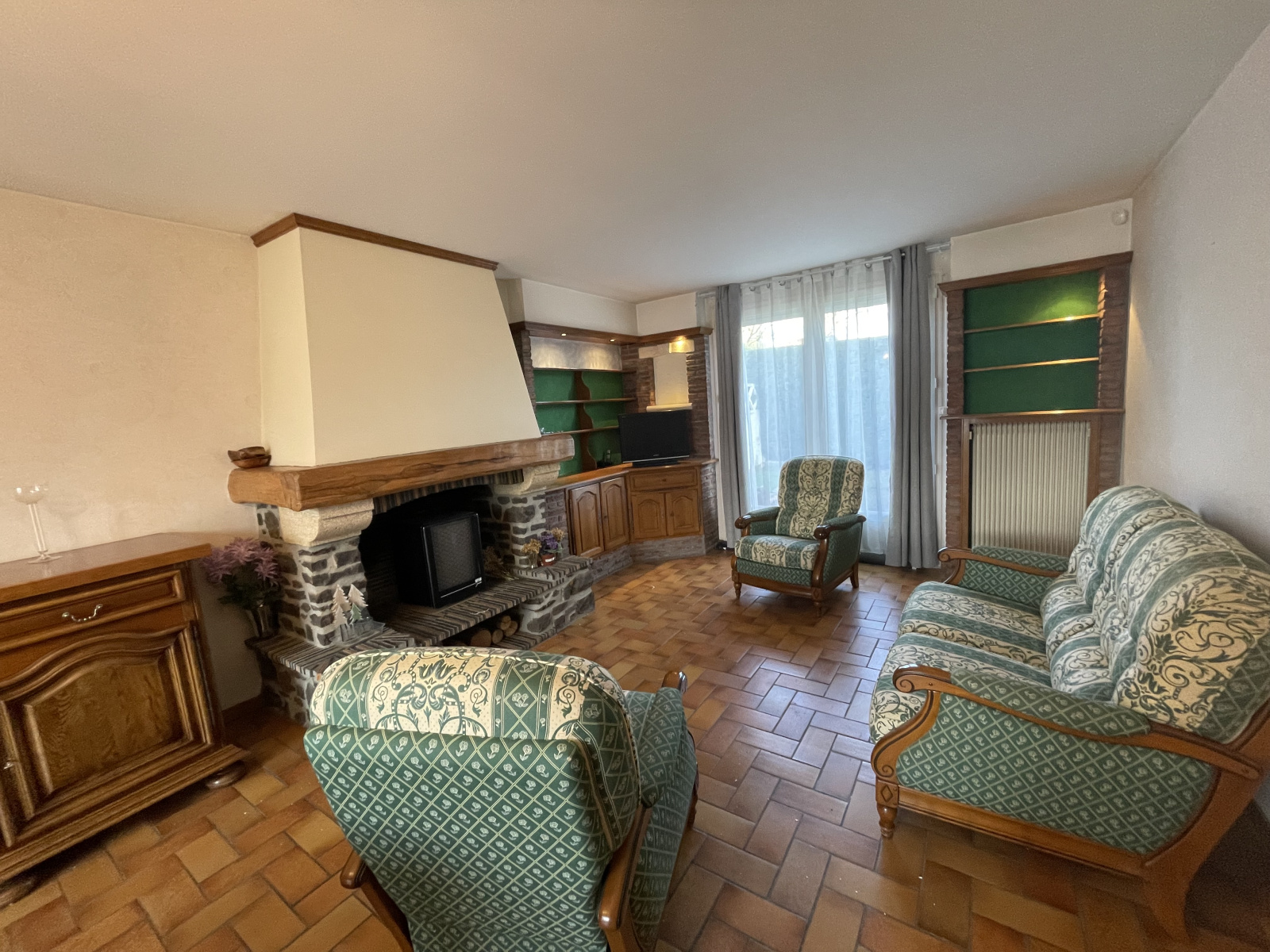 au Rdc : hall d'entrée, séjour/salon de 27 m², cuisine aménagée, WC, cellier