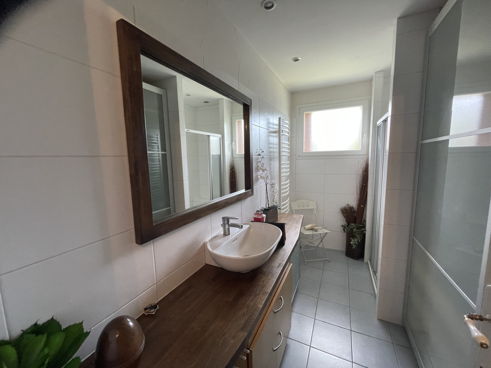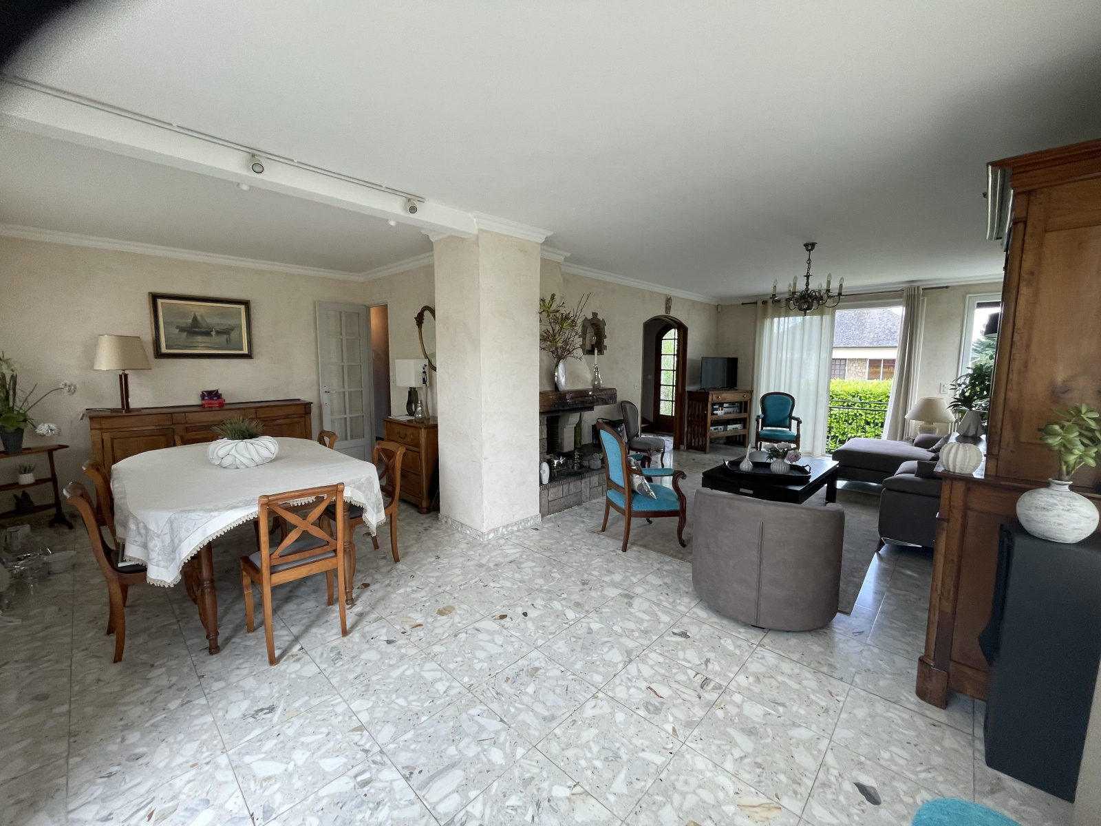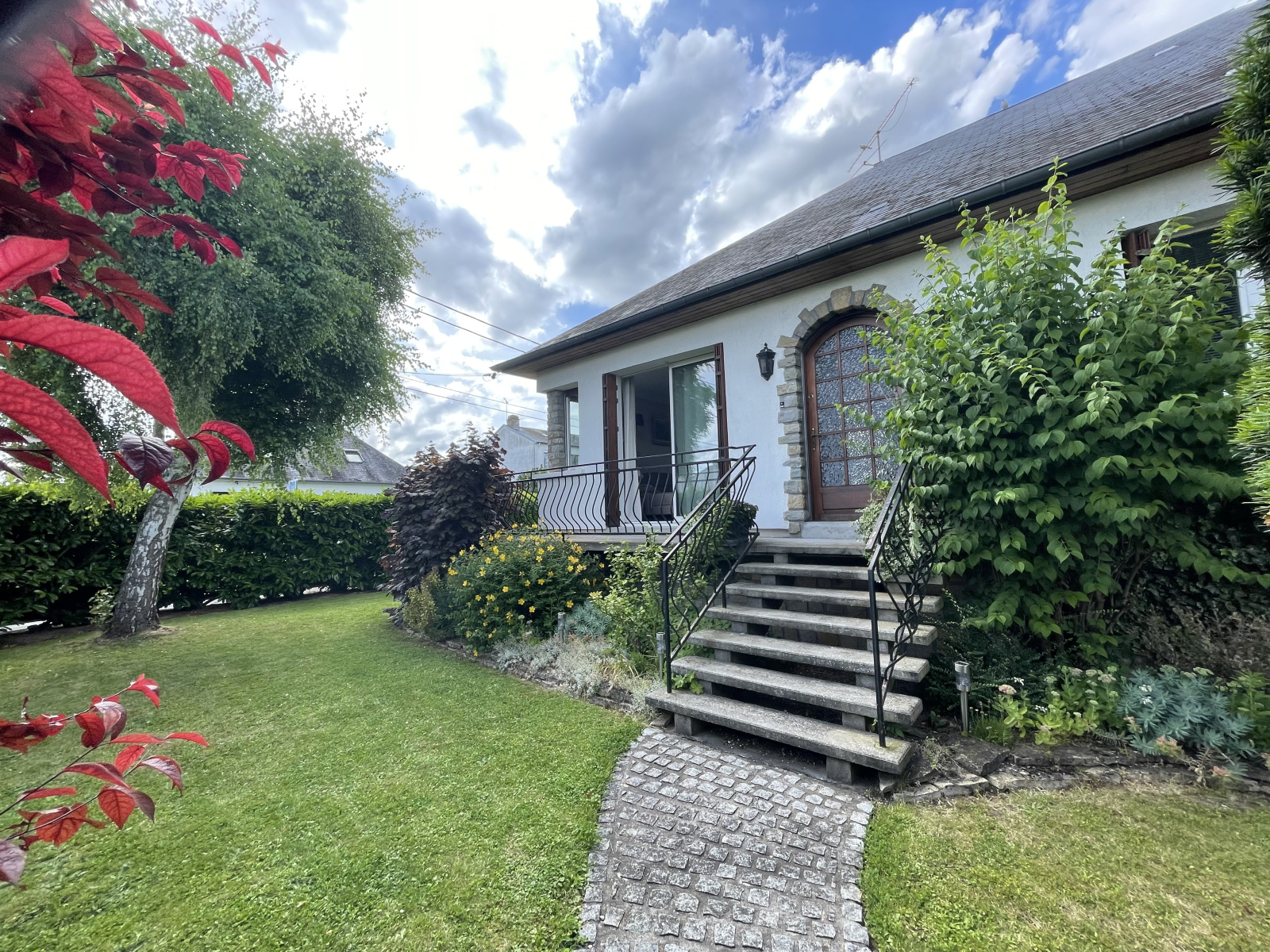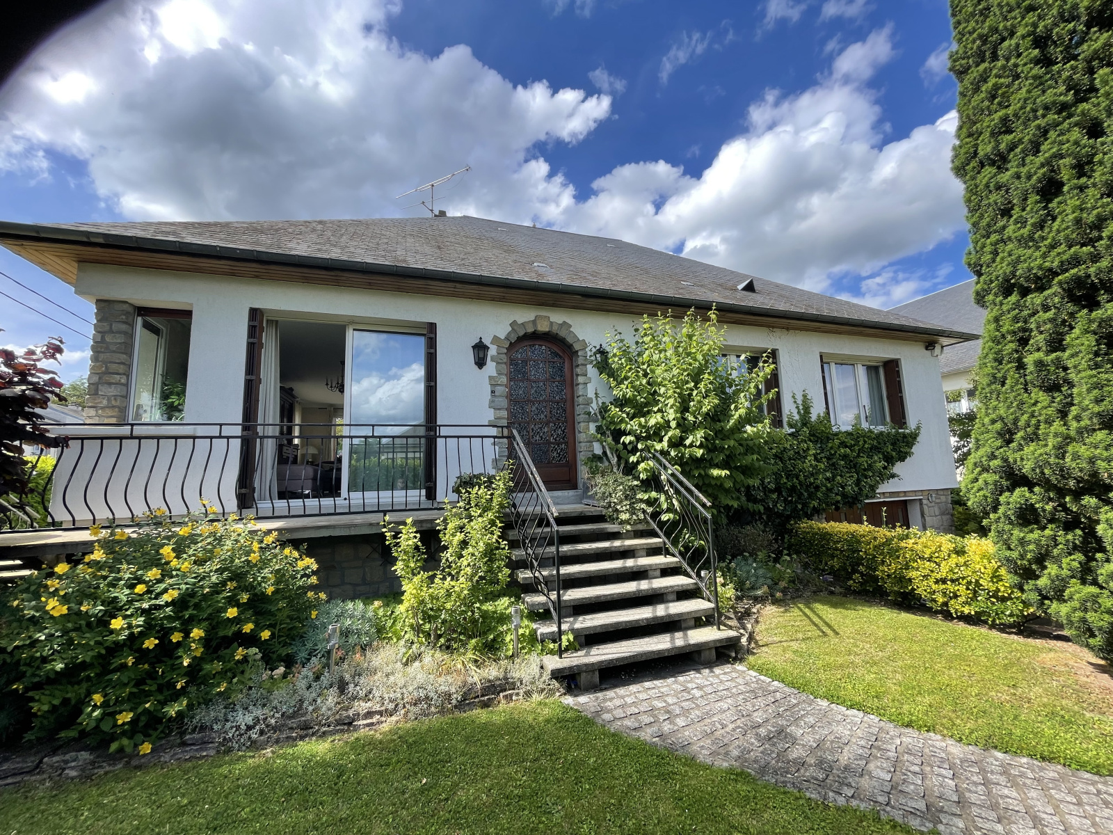au rdc : grand hall d'entrée, séjour/salon en L de 42 m², cuisine A/E, WC, salle d'eau, 2 chambres de plain-pied,