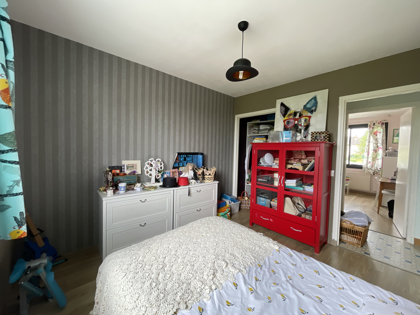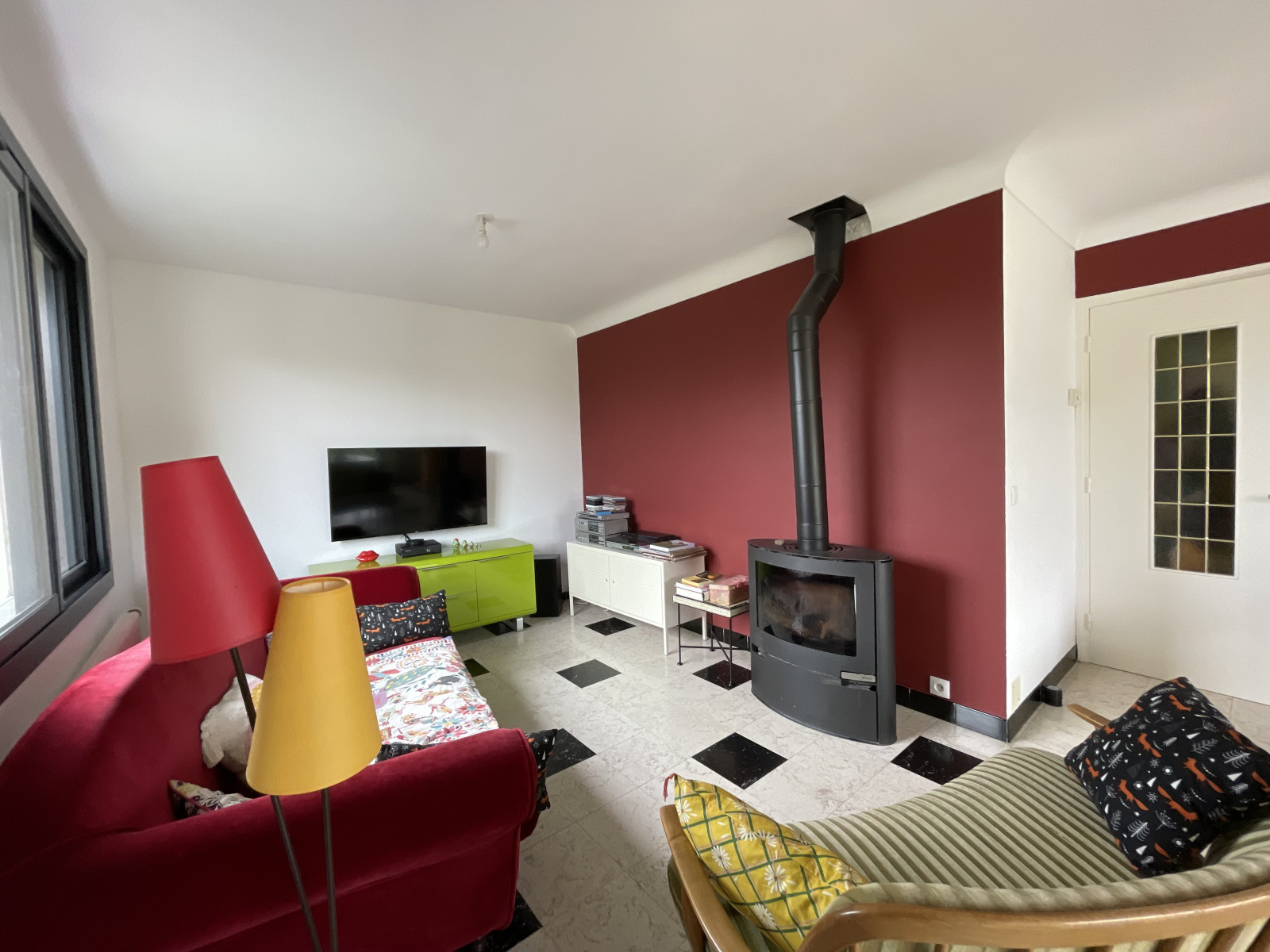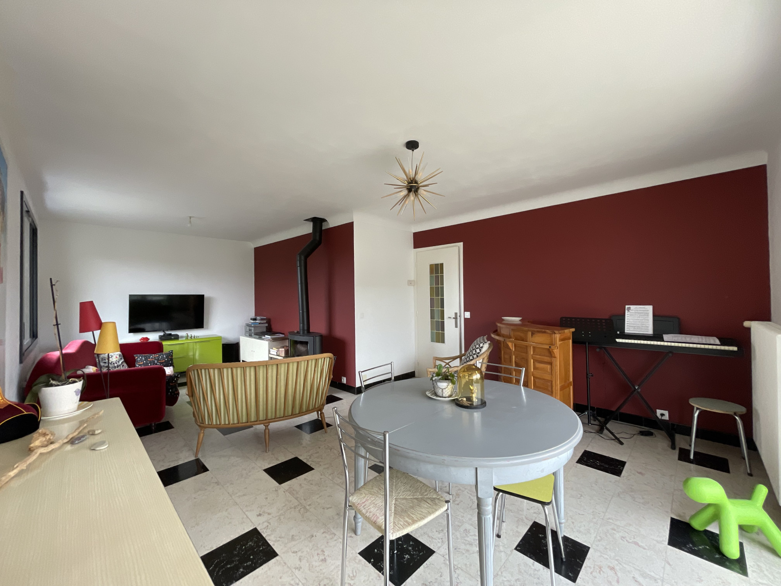 au rdc : grand hall d'entrée desservant un séjour/salon très lumineux (possibilité d'installer un poêle à bois), 1 cuisine séparée aménagée et équipée, WC, puis un couloir dessert 3 chambres de plain-pied (dont 1 avec dressing) et une salle de bains